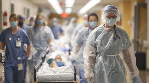 Healthcare workers in protective gear transport a patient on a stretcher in a hospital hallway, demonstrating teamwork and urgency.