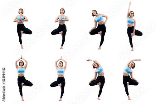 Healthy and active young woman in sportswear with different professional fitness posture set of yoga training session. Meditation yoga exercise on isolated background in gaiety full body length shot.