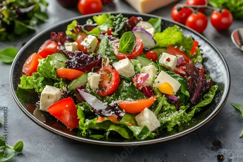 healthy and fresh salad full of tomatoes, cucumbers, feta cheese and other vegetables