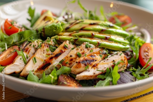 Healthy Balanced Lunch: Grilled Chicken Salad with Avocado, Cherry Tomatoes, and Mixed Greens for Contemporary Dining