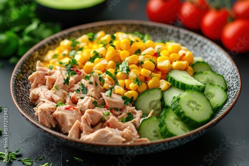 Healthy bowl with tuna salad featuring corn and cucumber, served in a rustic dish with vibrant greens and fresh ingredients