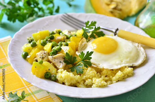 Healthy breakfast - couscous,vegetable ragout with chicken and f