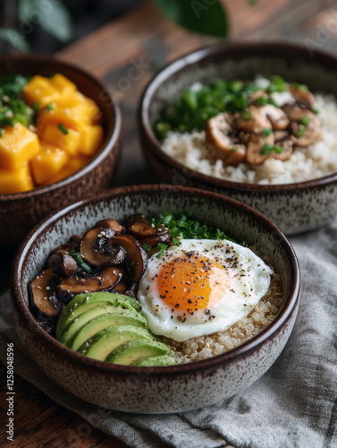 Healthy breakfast bowl with avocado, egg, and mushroom on quinoa.
