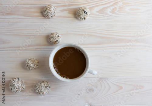 Healthy breakfast concept, energy balls or protein bars and a cup of cappuccino on a wooden background, copy space, horizontal orientation, flat lay, healthy snack for vegans