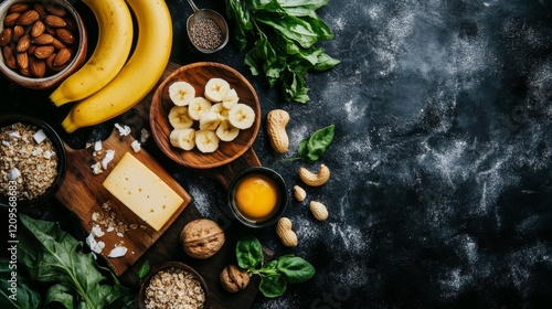Healthy Breakfast Ingredients Bananas, Nuts, Oats, and Spinach