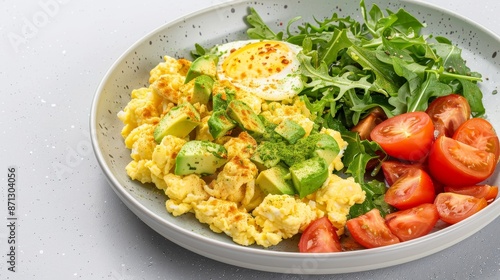 Healthy breakfast of scrambled eggs, greens, avocado, diced tomatoes on a modern plate, isolated background, studio lighting, perfect for advertising