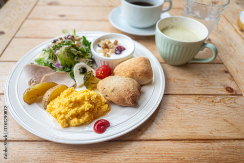 Healthy breakfast plate with scrambled eggs salad bread and coffee on wooden table