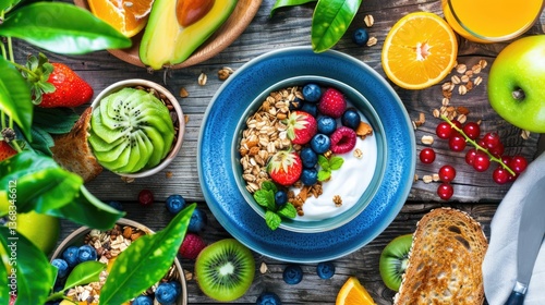 Healthy breakfast spread over rustic table top view food photography natural setting