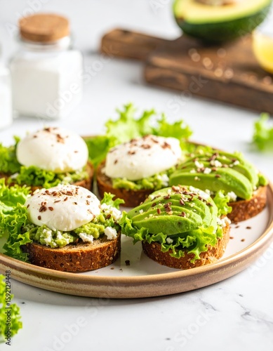 Healthy breakfast with poached eggs, whole-grain toast topped with avocado and cottage cheese, flax seeds, and lettuce rustic and fresh on marble.