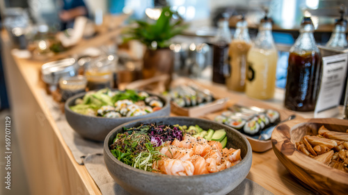 Healthy buffet featuring fresh salads, sushi rolls, and flavorful dressings for a nourishing and balanced meal experience.