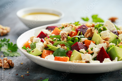 Healthy Butternut squash salad with beetroot, avocado, walnut and feta cheese in white bowl