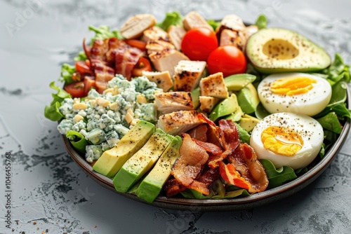 Healthy cobb salad with chicken avocado bacon blue cheese tomato eggs on gray background Classic American dish keto friendly Close up