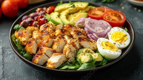 Healthy cobb salad with chicken, avocado, tomato, red onions and eggs. American food.