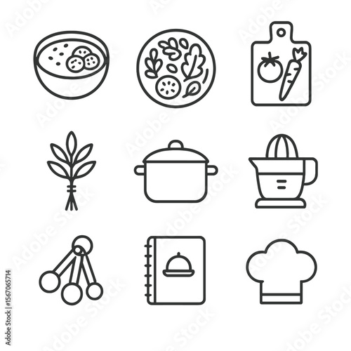 Healthy Cuisine Icons. Outline icon set of healthy cuisine workshops: smoothie bowl, salad plate, chopping board with veggies,