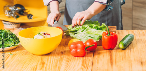 Healthy diet. Woman chopping lettuce, making salad with fresh vegetables. Vegetarian lifestyle.