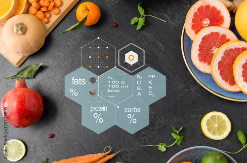 healthy eating, food and diet concept - different vegetables and fruits on on slate table over nutritional value chart