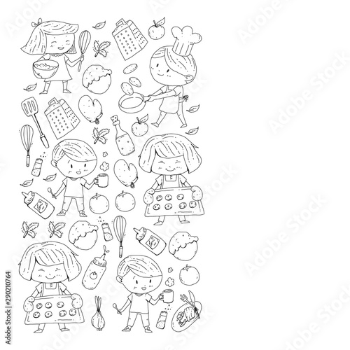 Healthy food and cooking. Fruits, vegetables, household. Doodle vector set.