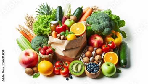 Healthy food background. Healthy food in paper bag vegetables and fruits on white. Food delivery, shopping food supermarket concept