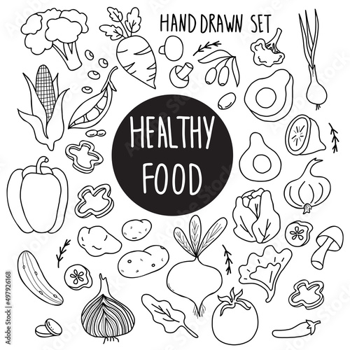 Healthy food. Big set of linear vector vegetables. Root vegetables and mushrooms, avocado and olives, tomato and corn, onion and garlic, cucumber and lemon. Isolated hand drawn doodles for design