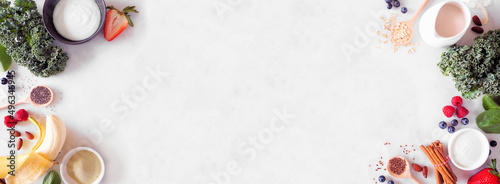 Healthy food double border. Smoothie making concept. Overhead view on a white marble banner background. Copy space. Fruit, yogurt, almond milk and a selection of ingredients.