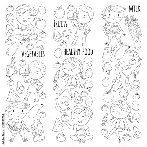 Healthy food for children. Kindergarten, school kids eating watermelon, eggplant, fish, tomato, avocado, milk, carrot, mushrooms. Fruits and vegetables. Vector patterns.