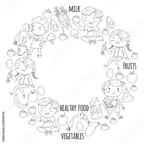 Healthy food for children. Kindergarten, school kids eating watermelon, eggplant, fish, tomato, avocado, milk, carrot, mushrooms. Fruits and vegetables. Vector patterns.