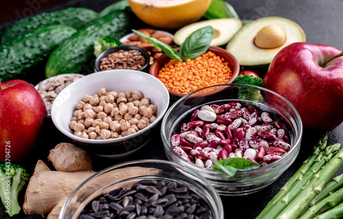 Healthy food. Fresh fruits, vegetables and seeds on a stone background.