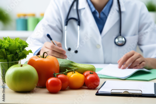 Healthy Food. fresh vegetable and fruit on desk with nutritionist male doctor working at office hospital, food science, nutrition, diet plan, nutrition, healthy food concept, Generative AI