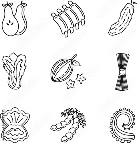 healthy food icons consist of beef ribs, bitter melon, white cabbage, star fruit, pasta, clams, tamarind, octopus with line art style