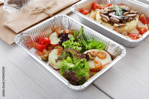 Healthy food in boxes, diet concept.