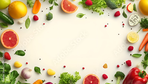 Healthy Food Ingredients Background: Top View of Fresh Vegetables and Fruits with Space for Text - Recipe and Menu Card Template