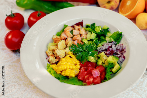 Healthy food, salad with shrimps, tomatoes, corn and avocado on a white table