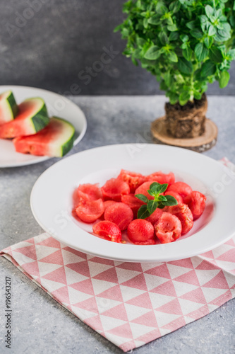 Healthy fresh organic watermelon salad with basil closeup