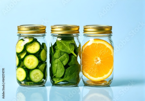 Healthy Glass Jar Snacks: Fresh Cucumber, Spinach and Orange