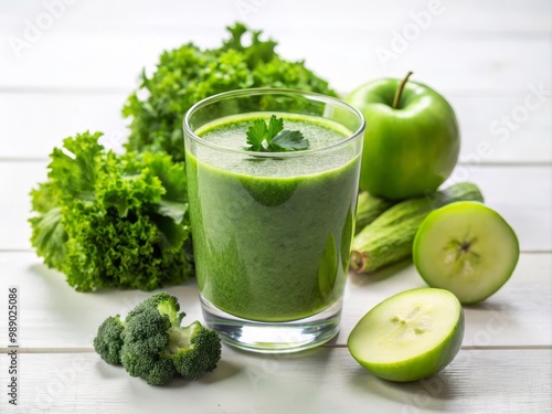 Healthy green blend of kale, apple, and cucumber takes center stage in clear glass, beautifully arranged on pristine white background, warm gentle light, uplifting and rejuvenating ambiance.
