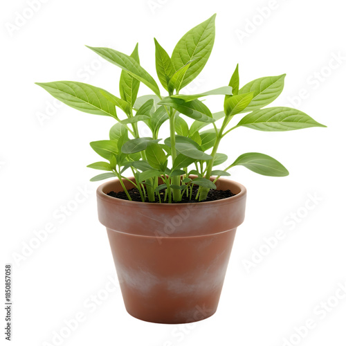 Healthy green plant growing in a rustic terracotta pot showcasing lush foliage