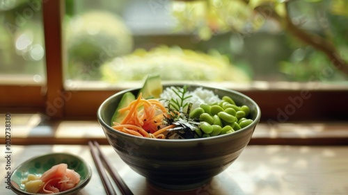 Healthy japanese cuisine bowl with edamame and vegetables by a sunlit window