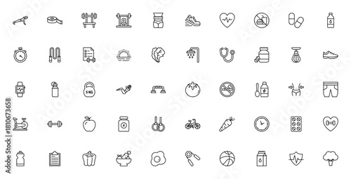 Healthy Life icon set. Fitness and wellness vector ions. Includes symbols for xercise, gym, diet, healthcheck, no smoking, sports quipment and more. Clean vctor design.
