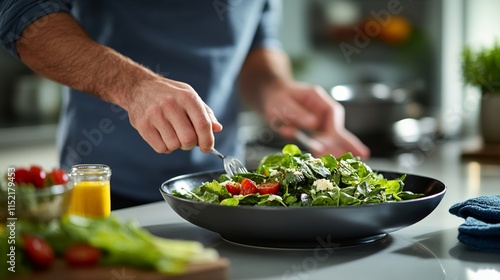Healthy Lifestyle Choice Man Enjoying Fresh, Vibrant Salad in a Modern Kitchen Setting.