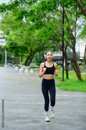 Healthy lifestyle concept with young female athlete running in a natural, urban park