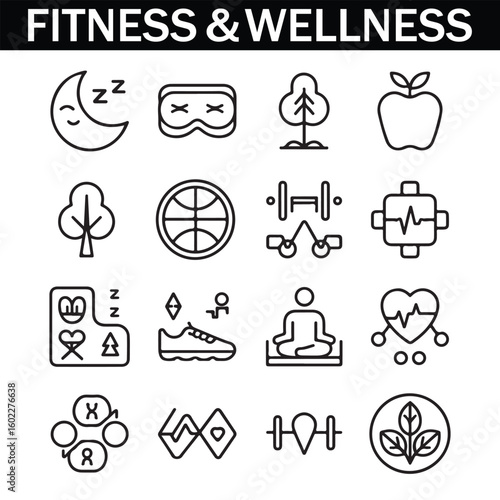 Healthy Lifestyle Vector Icon Set with Adjustable Line Weight Featuring Fitness, Nutrition, Exercise, Wellness, Sleep, Yoga, Meditation, Heart Rate, Gym, Hiking, Cycling, Sports, and Health Monitoring