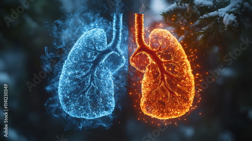 Healthy lungs and smoker lungs depicted with glowing blue and orange effects