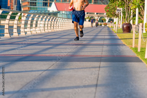 Healthy man running exercise in the morning in Marina Bay Sand park, Singapore.