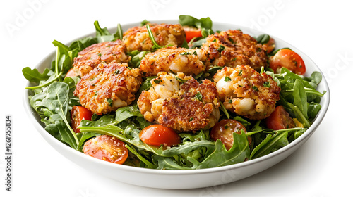 Healthy Maryland Crab Cakes Served on a Fresh Salad with Tomatoes and Greens