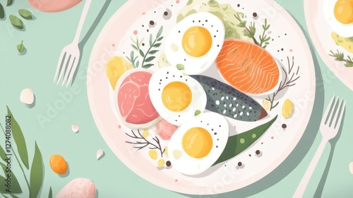 Healthy meal plate, colorful eggs, fish, and vegetables