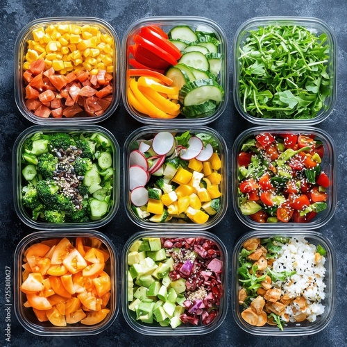 Healthy meal prep ideas organized containers with diverse salads kitchen food photography tidy environment overhead view nutrition benefits
