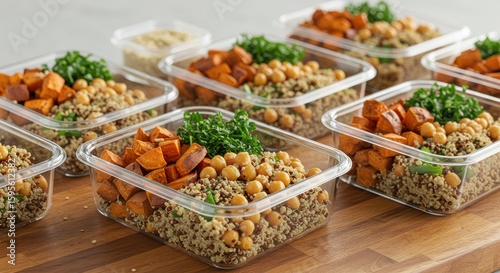 Healthy Meal Prep with Quinoa, Chickpeas, Sweet Potatoes, and Fresh Greens in Clear Containers
