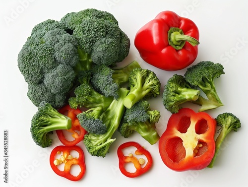 healthy nutrition, dishes from fresh broccoli and red pepper. Macro photo green fresh vegetable broccoli