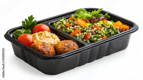 Healthy Portioned Meal In Plastic Takeout Container With Salad Chicken And Rice