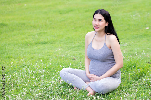 Healthy pregnant woman doing yoga in nature outdoors. Close up